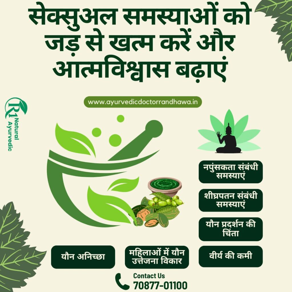 Looking for Natural Solutions for Sexual Problems? Dr. Randhawa’s R1 Natural Ayurvedic treatments are designed to improve blood flow, enhance nerve sensitivity, and promote overall sexual wellness. Personalized, drug-free plans for lasting results.